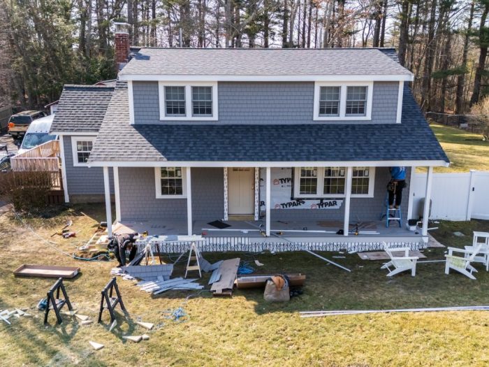 - Replacement of old vinyl siding with new, energy-efficient fiber cement siding.
